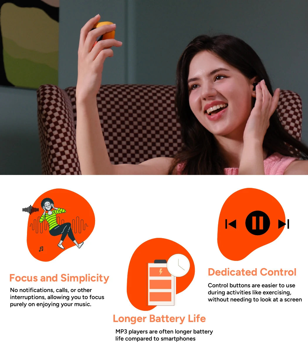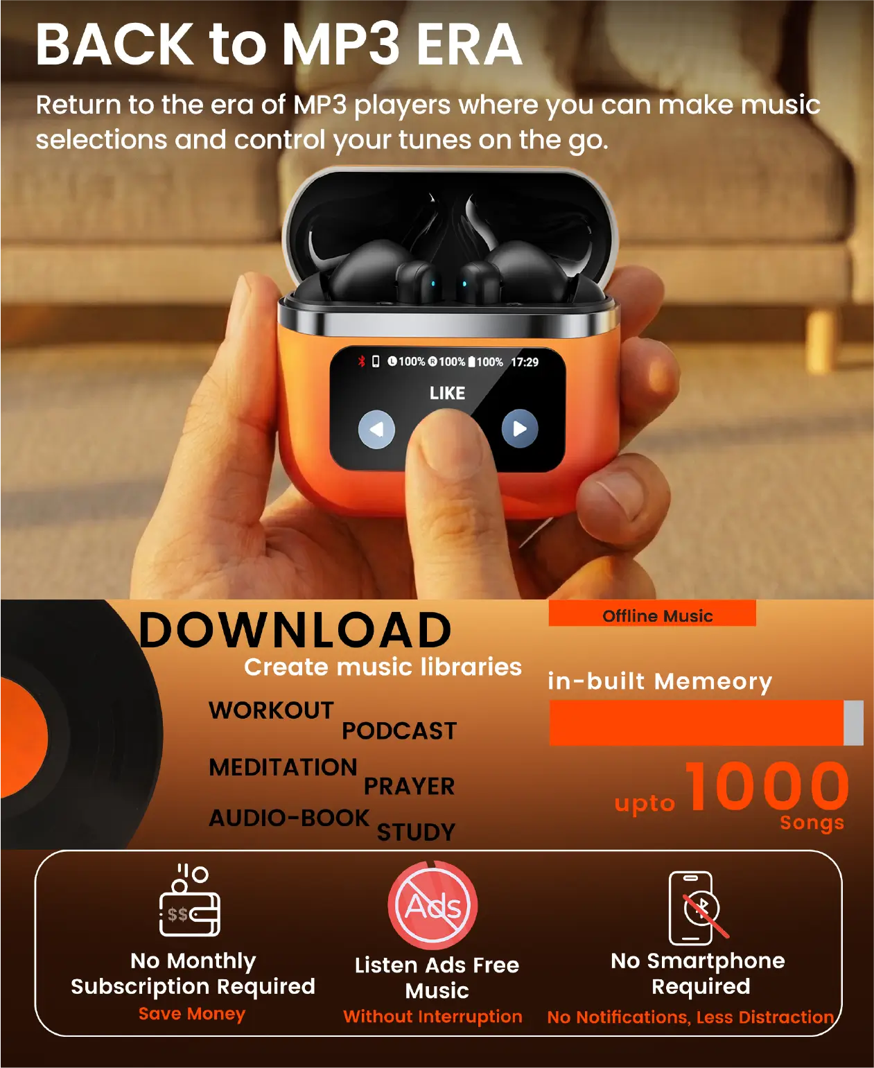Enjoy offline music with Relod TouchBuds—no monthly subscription, ads, or interruptions. Save money, avoid distractions, and listen seamlessly without needing a smartphone. Perfect for focused, hassle-free experiences!